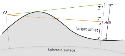 An Above Ground Level (AGL) raster is an optional output that represents the above ground height that the nonvisible target cells would need to be raised by to become visible. The following figure illustrates how the AGL value is determined. T is a target with a certain height (which is the target offset in the illustration). The sight line between the observer O and the target T is blocked by the terrain, so target T is not visible. If the target is raised to the new position T’, it becomes visible because there is now a clear sight line. The distance between T’ and the ground is the AGL value in the output raster.